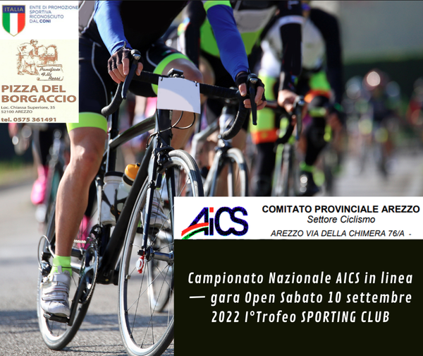 A Chiassa Superiore (AR), il 10 Settembre 2022 La Direzione Nazionale AiCS – Dipartimento Sport, in collaborazione con il Comitato Provinciale AiCS Arezzo e la Polisportiva AiCS a.s.d, organizzano il 1° Trofeo Sporting Club, valido come Campionato Nazionale AiCS Cicloamatori su strada. Il Campionato si terrà il giorno 10 Settembre 2022, presso il Circolo Sporting Club a Chiassa Superiore, Arezzo…