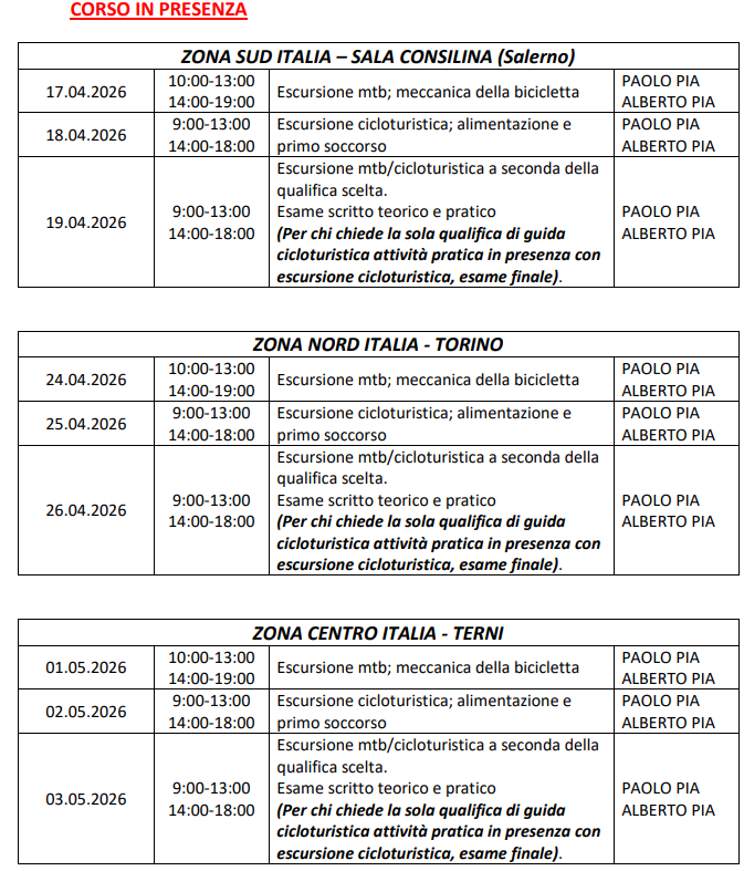 la frequenza del modulo pratico di 3 giorni per chi ha una qualifica di Guida Ciclo-Turistica in un altro