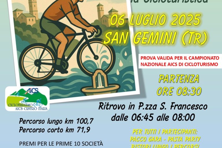 La Mediofondo Città di San Gemini “La cicloturistica” in programma a San Gemini (TR) il 6 luglio 2025, sarà valida come Campionato Nazionale AiCS di Cicloturismo. Il Campionato è organizzato dalla Direzione Nazionale, Dipartimento Sport, e dalla Commissione tecnica nazionale di Ciclismo, in collaborazione con il Comitato Regionale AiCS Umbria, il Comitato Provinciale AiCS di…